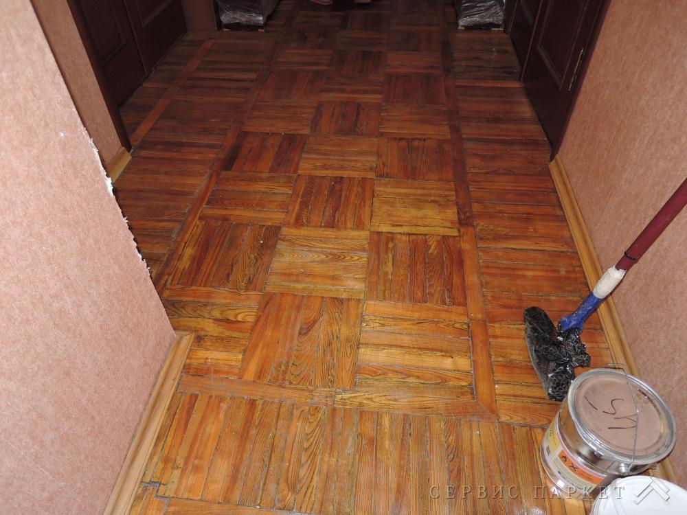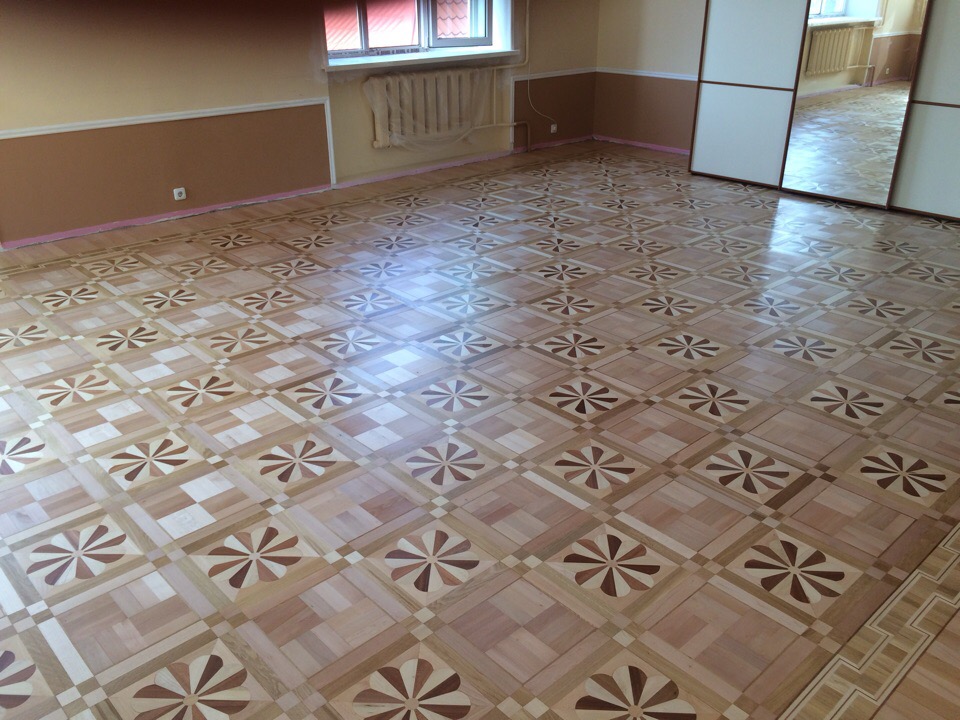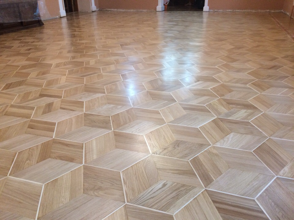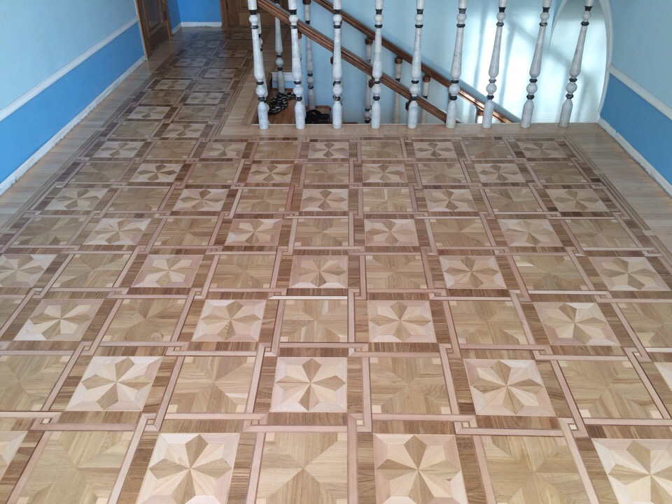 Художественный паркет - нанесен немецкий, водный, ДВУХКОМПОНЕНТНЫЙ лак фирмы Smola (Stauf), 2-м слоем наносим гель третим слоем наносим то же лак. еврошлифовка